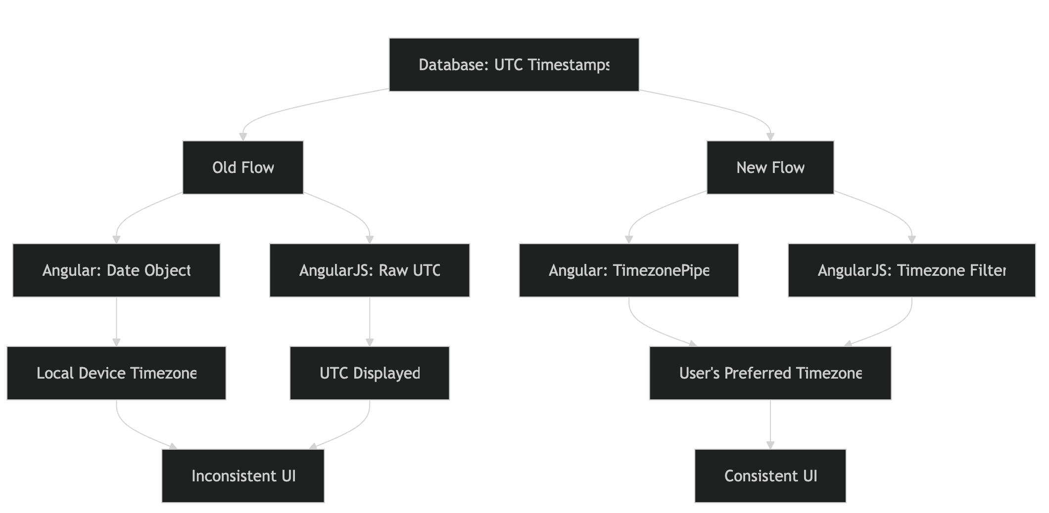 Example: A London-based employee sets their timezone to “Asia/Kolkata.” An expense timestamp shows “10:00 AM Europe/London” in one component (Angular) but “3:30 PM UTC” in another (AngularJS). Confusion guaranteed.