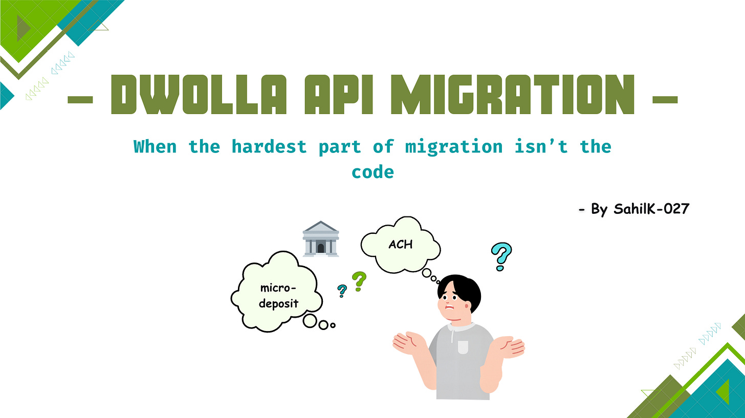 If you’ve read my prior migration posts: Projects API Migration (single-endpoint refactor) and Corporate Credit Cards API Migration (wide-scope migration across payment flows), you know how and why we are migrating APIs. As a developer, for me, each API migration comes with something new. And with every migration, I learned new things and thought I had a decent mental model of what these things looked like. For every other aspect, Dwolla API Migration follows the same disciplined process, but with one important twist: the Dwolla migration required learning payment-domain concepts (ACH, micro-deposits, beneficial owners) to get the frontend behavior correct.